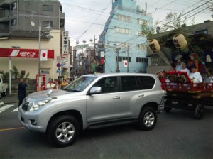 驚いた事に山車は人間ではなく、高級オフロード自動車で牽引されていました。